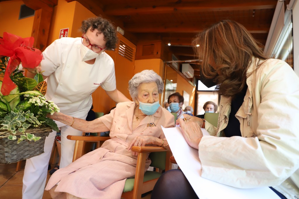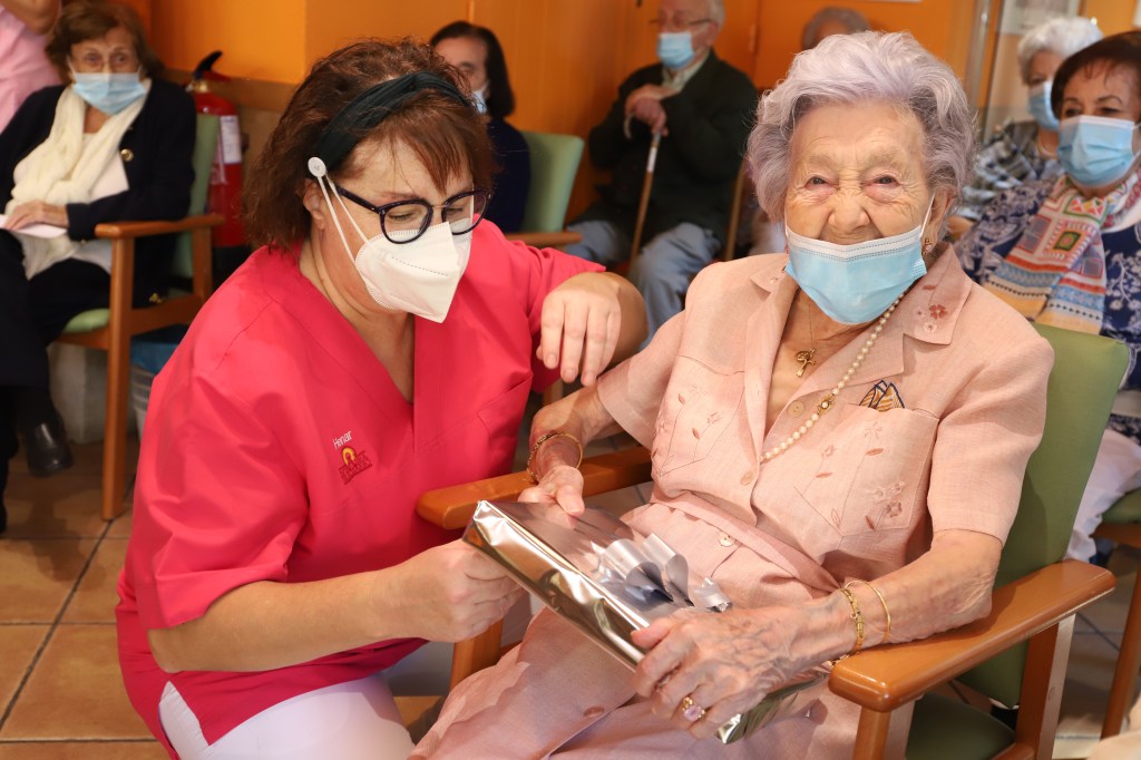 Posteriormente, el administrador y la directora del centro, así como numerosos de los trabajadores hacían entrega de los regalos. Entre ellos, la partida de nacimiento de Carmen Sanz y una emotiva carta del alcalde de su localidad natal, la mencionada, La Seca, que entre otras cosas, le recordaba momentos memorables de la vida del pueblo que ella atesora, como la caída de la torre de la Iglesia, ahora reconstruida y a la que se le ha colocado una escalera, o la vendimias que año tras años ha vivido la localidad. Gregorio Bayón Piñero, alcalde de La Seca le decía “es un honor como lasecano y alcalde poder felicitar por su centenario a una vecina que ha crecido como nuestros viñedos, calada del buen mosto y aguerrida a nuestros suelos pedregosos que la han hecho fuerte para vivir tanto”. Tras la misma, la lectura de la misiva del alcalde de Valladolid, ciudad que la acogió desde que acudiera a la misma a estudiar secundaria y con la que le deseaba lo mejor.