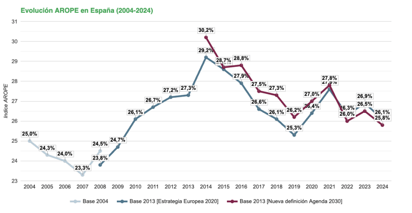 El descenso de 0,7 puntos porcentuales respecto al año anterior confirma una tendencia de ligera mejora tras los impactos de la crisis sanitaria y la inflación. No obstante, los niveles actuales siguen superando los existentes antes de la crisis financiera de 2008, cuando la tasa AROPE se situaba en el 23,8%.