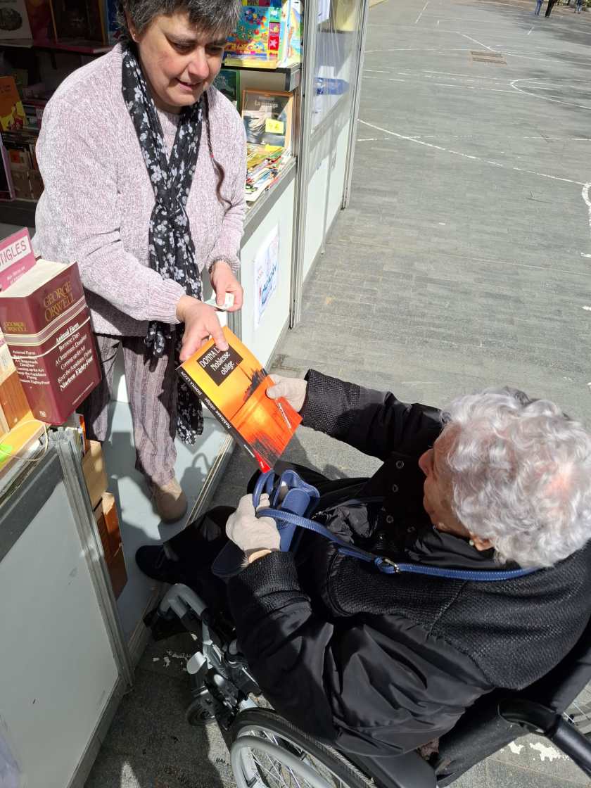 Marie Claude Laborde, residente centenaria del centro geriátrico Lacort de Viana de Cega, realiza una visita a Valladolid para acudir, entre otros, a la feria de libro antiguo, donde elige varios volúmenes en su lengua materna.